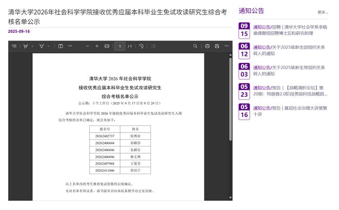 新京报讯 9月16日,清华大学2026年社会科学学院接收优秀应届本科毕业生免试攻读研究生综合考核名单公示,中国乒乓球队运动员孙颖莎、王曼昱在列。