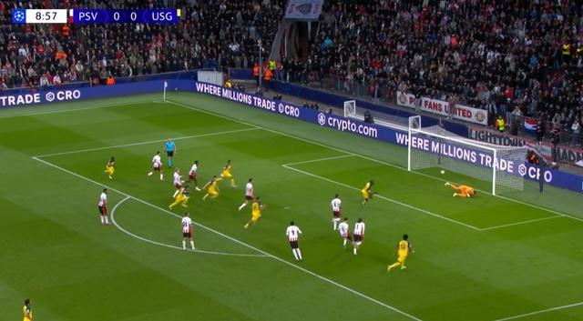 比赛第9分钟,埃因霍温防守球员禁区内解围时踢倒对方送点,普罗米斯-戴维主罚一蹴而就!