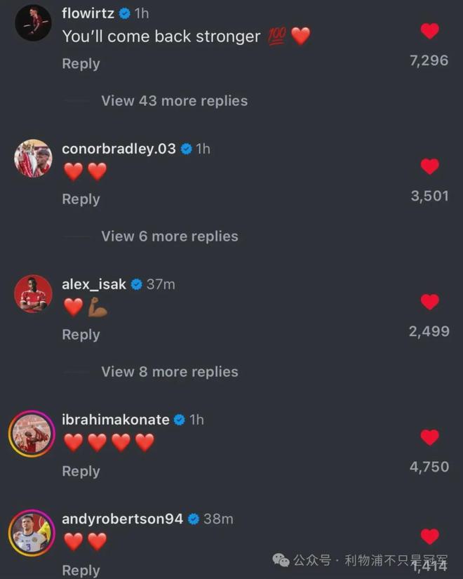 利物浦队友们纷纷在社媒上为莱奥尼送上安慰,祝他归来时更加强大!