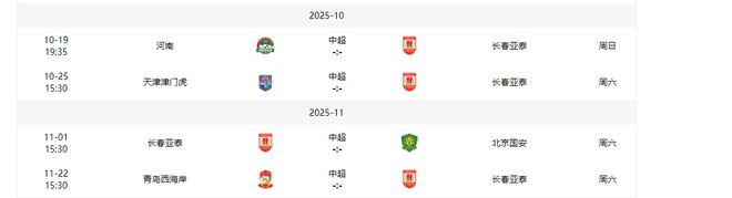 长春亚泰1主场3客场,对手包括河南队(11名)、天津津门虎(6)、北京国安(4)、青岛西海岸(8)