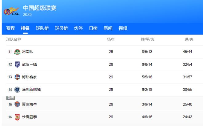 25赛季中超26轮赛程过后,排在积分榜最后四位的球队是长春亚泰、青岛海牛、深圳新鹏城、梅州客家。