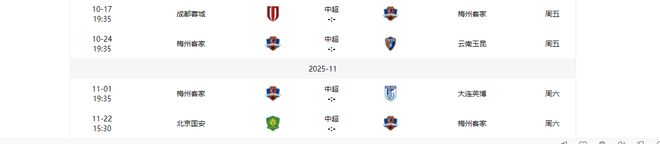 梅州客家2主2客,对手有成都蓉城(2)、云南玉昆(10)、大连英博(9)、北京国安(4)