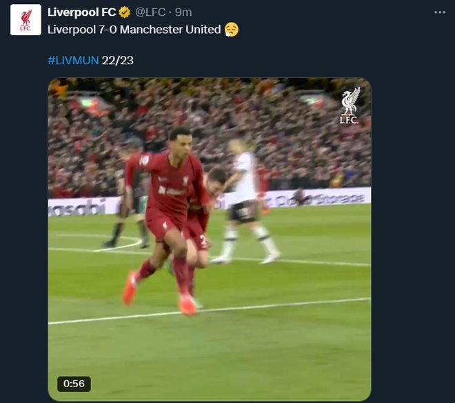 雷速体育10月18日讯 新赛季英超首回合“双红会”即将在北京时间明晚23:30打响,赛前,利物浦官方社媒还特别发布了22/23赛季,利物浦主场7-0狂胜曼联的经典名局。