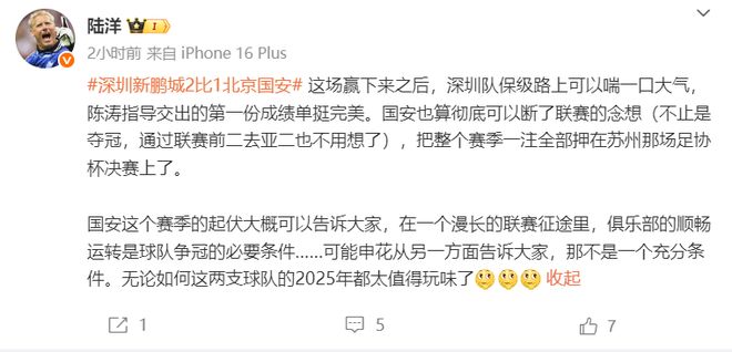 记者丰臻则是在个人社媒这样写道:“死亡赛程第一场直接赢了,最悲观的深圳突然最乐观了。深圳新鹏城是一支神奇的球队,去年只干了一件事,平申花。今年只干了两件事,赢申花赢国安。但是国安比新鹏城更神奇八千倍。”