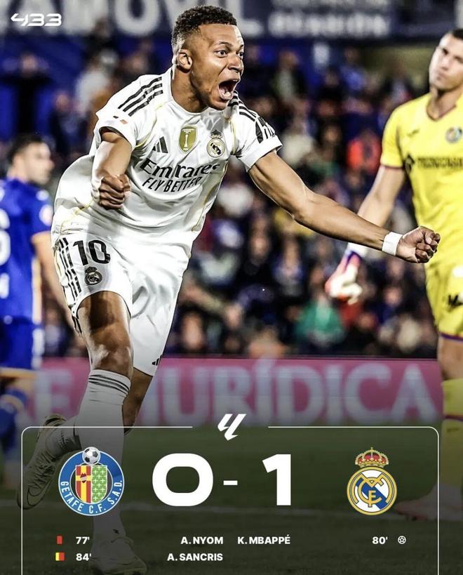 西甲第9轮,皇马客场挑战赫塔费,上半场,双方互交白卷,下半场比赛,恩约姆替补登场对维尼修斯犯规闪电染红,一直到第80分钟,姆巴佩打进一球。