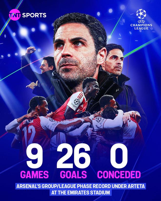 值得一提的是,阿尔特塔入主阿森纳以来,枪手在欧冠联赛/小组赛阶段的主场比赛,从未有过败绩,而且0丢球。