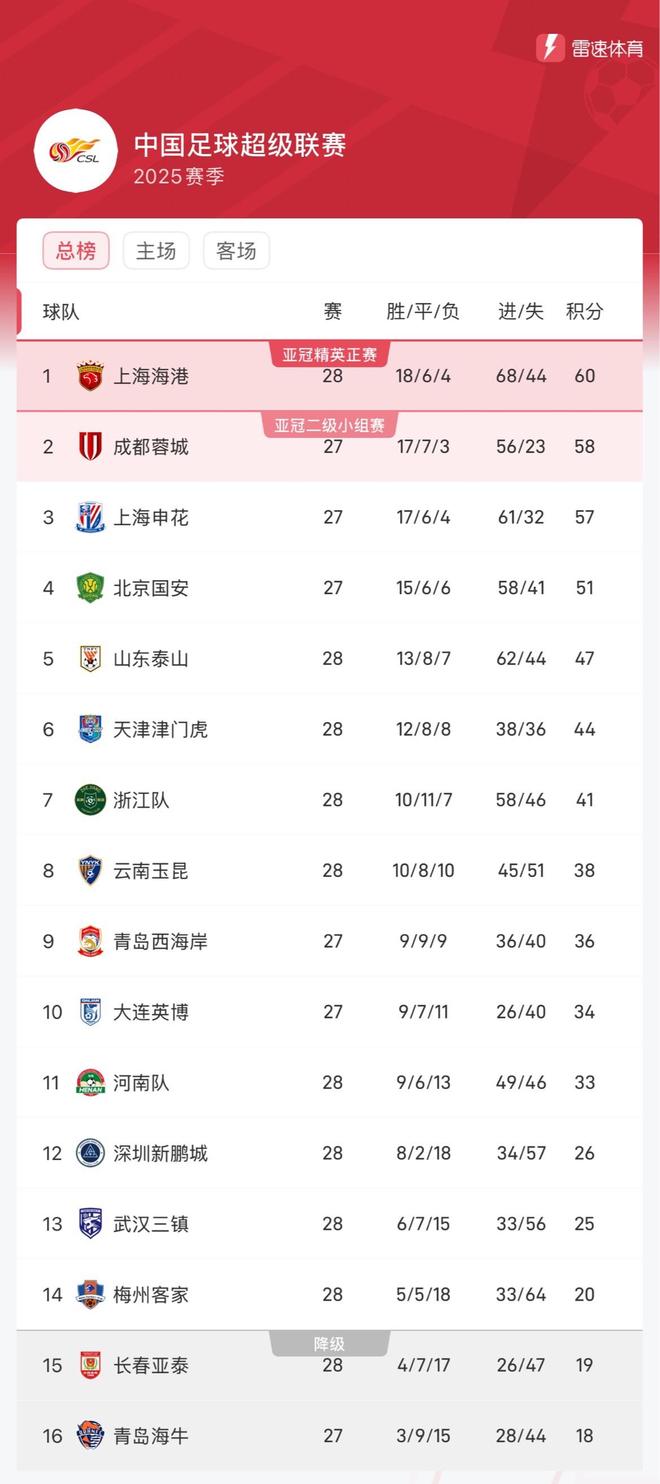 - 中超 | 中超实时积分:海港2分领先,蓉城取胜则升榜首,申花暂第三