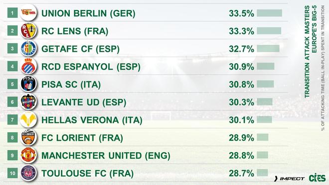 CIES(瑞士足球天文台)统计了五大联赛球队在攻防转换阶段球队进攻时间的占比排行。通俗说,在球权转换阶段,球队可以选择回传或者横传控制球权,也可以立即发起进攻。在这项统计中,柏林联合占比最高,曼联排名第九,是英超打转换最直接干脆的球队。