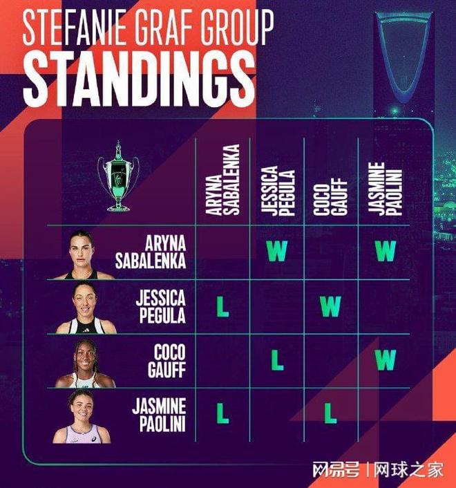 我们首先来关注利雅得WTA年终总决赛。北京时间今晨,单打格拉芙组结束了第二轮较量,头号种子、世界第一萨巴伦卡经过三盘激战,以6-4 2-6 6-3击败5号种子、美国名将佩古拉,为武网的失利复仇,取得小组赛两连胜。而卫冕冠军、3号种子高芙以6-3 6-2完胜有病在身的8号种子鲍里妮,收获小组赛首胜。