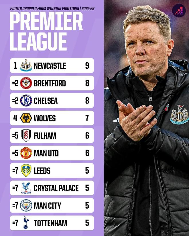上一轮纽卡在客场被布伦特福德逆转,据知名数据机构Opta统计,纽卡是本赛季英超领先之后丢分最多的球队,丢掉多达9分,布伦特福德、切尔西并列次席。