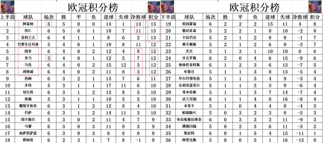 积分榜方面,拜仁逆转绝杀赢球后暂时追上阿森纳,2个净胜球之差位列第2,阿森纳继续领跑。国米被利物浦绝杀遭遇2连败,下滑到第5,亚特兰大则是暂时超过皇马,巴黎,升至第3。利物浦绝杀国米后,超过切尔西,曼城,多特冲进前8。巴萨小胜止住颓势,但是他们还无力进前8,净胜球劣势排在曼城,葡萄牙体育之后位列第14。