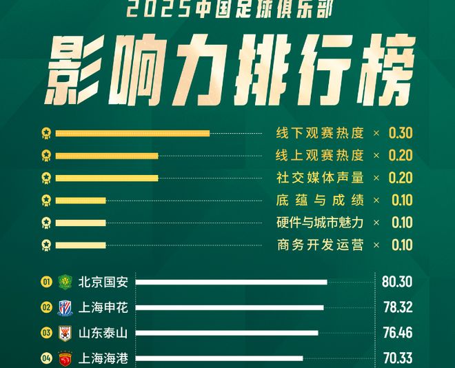 排名第一!北京国安成最具影响力俱乐部,申花第2,3中甲球队上榜
